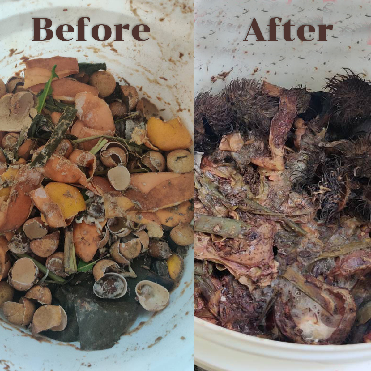 วัสดุที่ใช้หมัก: ใช้เฉพาะเศษอาหารแห้ง เช่น ผัก ผลไม้ หลีกเลี่ยงของเหลว (น้ำแกง น้ำผลไม้ นม) เพราะอาจทำให้เกิดจุลินทรีย์อื่นและส่งกลิ่นเหม็น